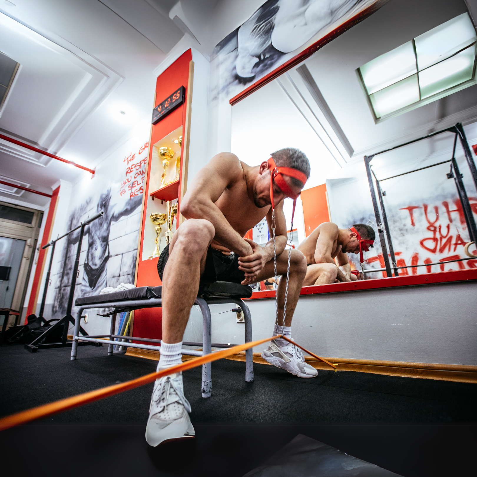 - Standing up with resistance bands or cables.